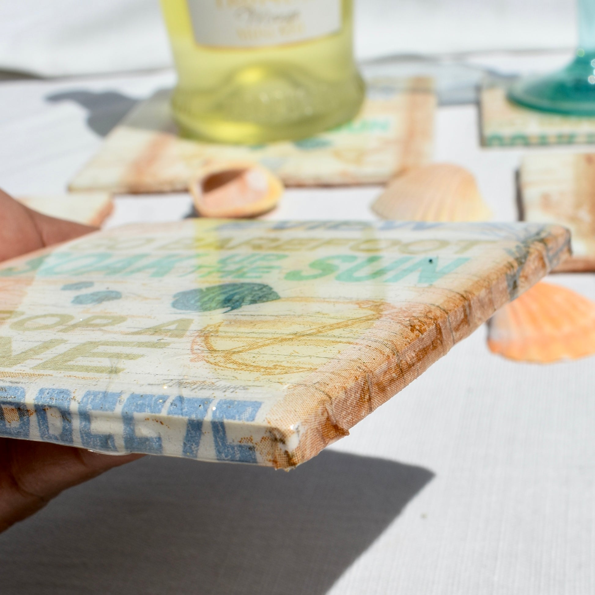 Combine art and function with these relaxing beach themed coasters! ย The shimmering iridescent sand and ocean blue letters will give your friends and guests something to talk about every time they pick up their drinks.ย They fit any dรฉcor โ formal or casual. ย More importantly, they protect your furnitureย from water rings.ย