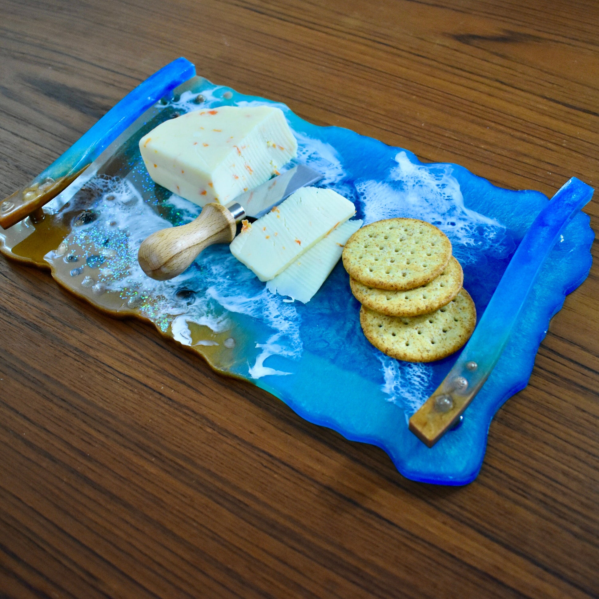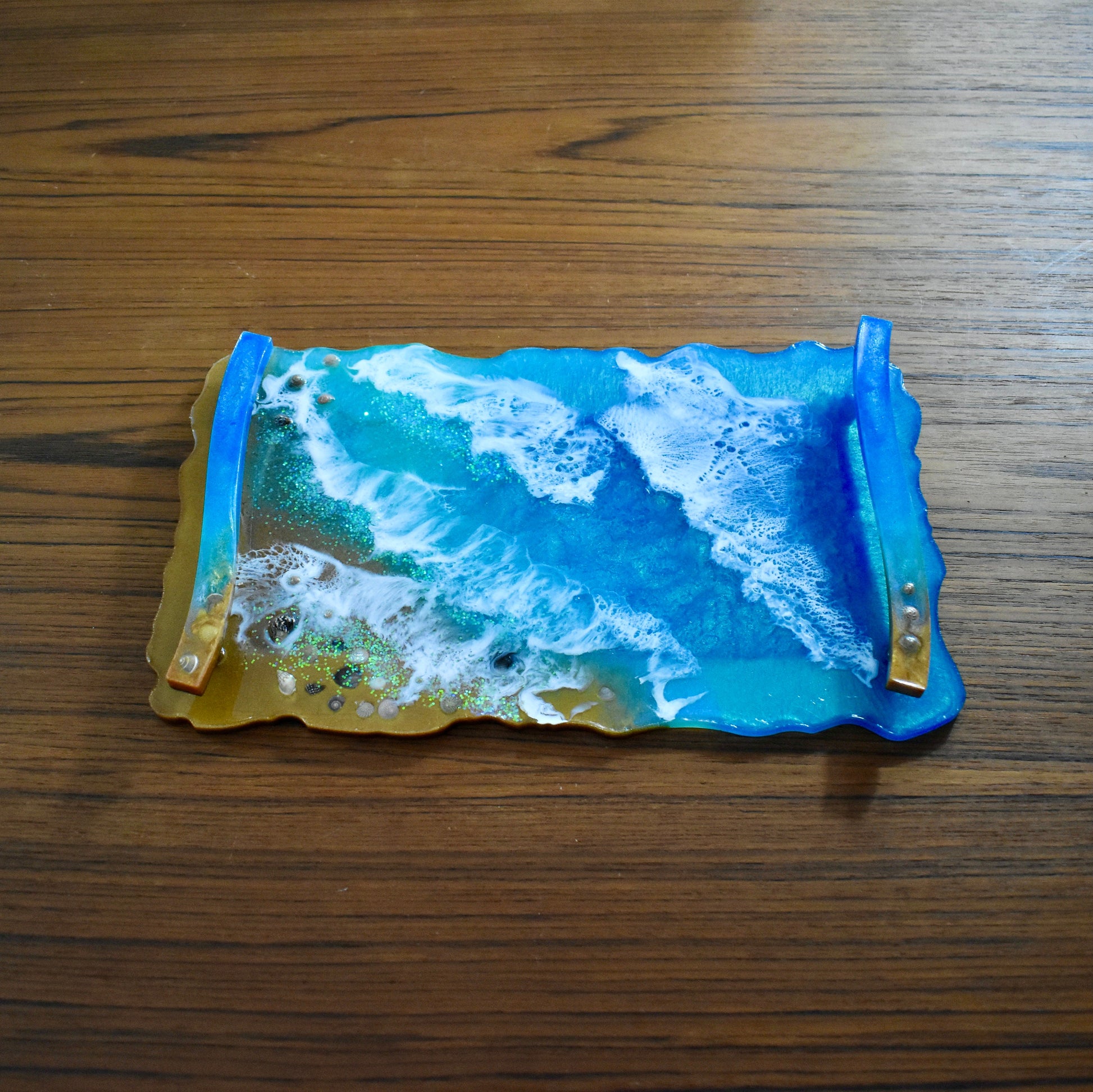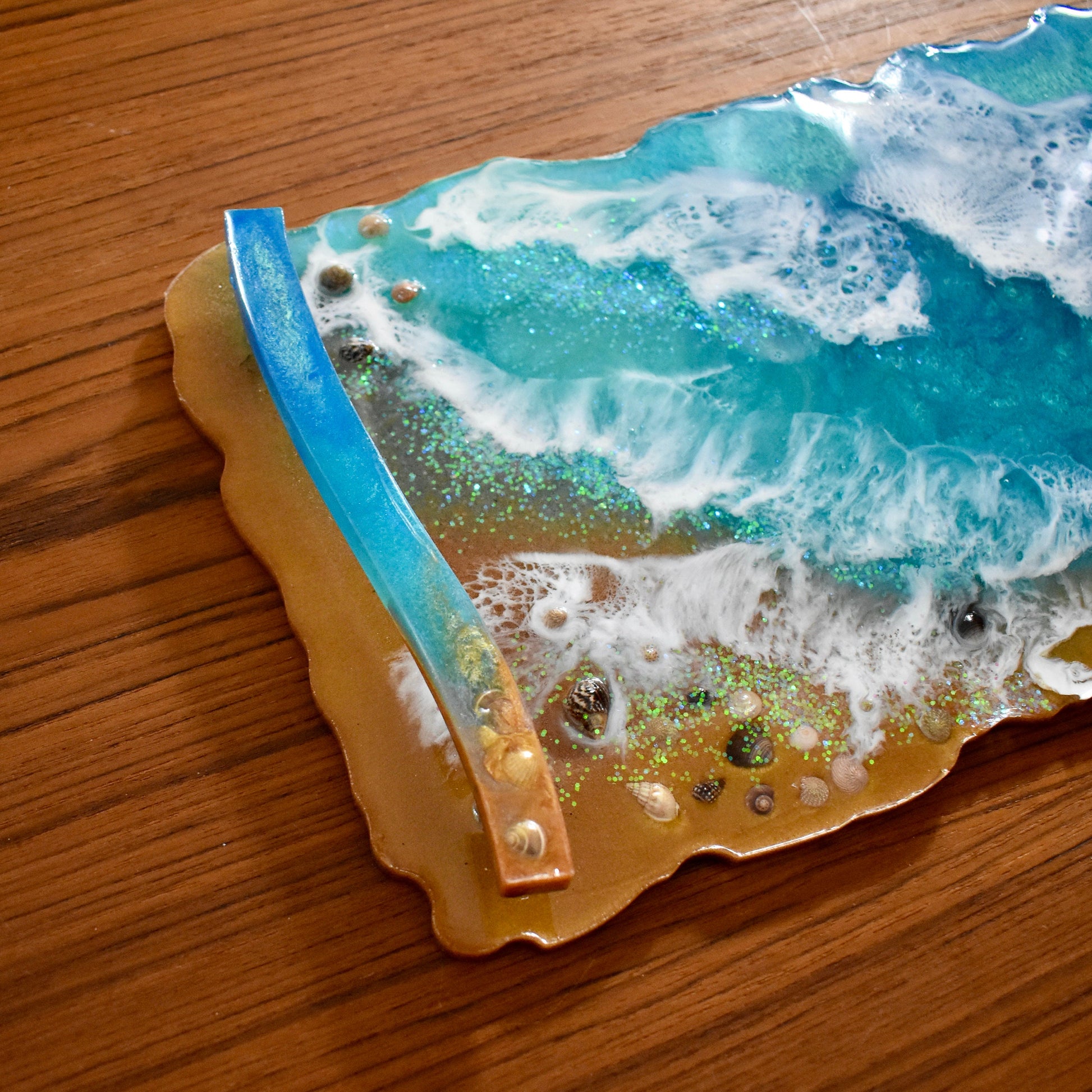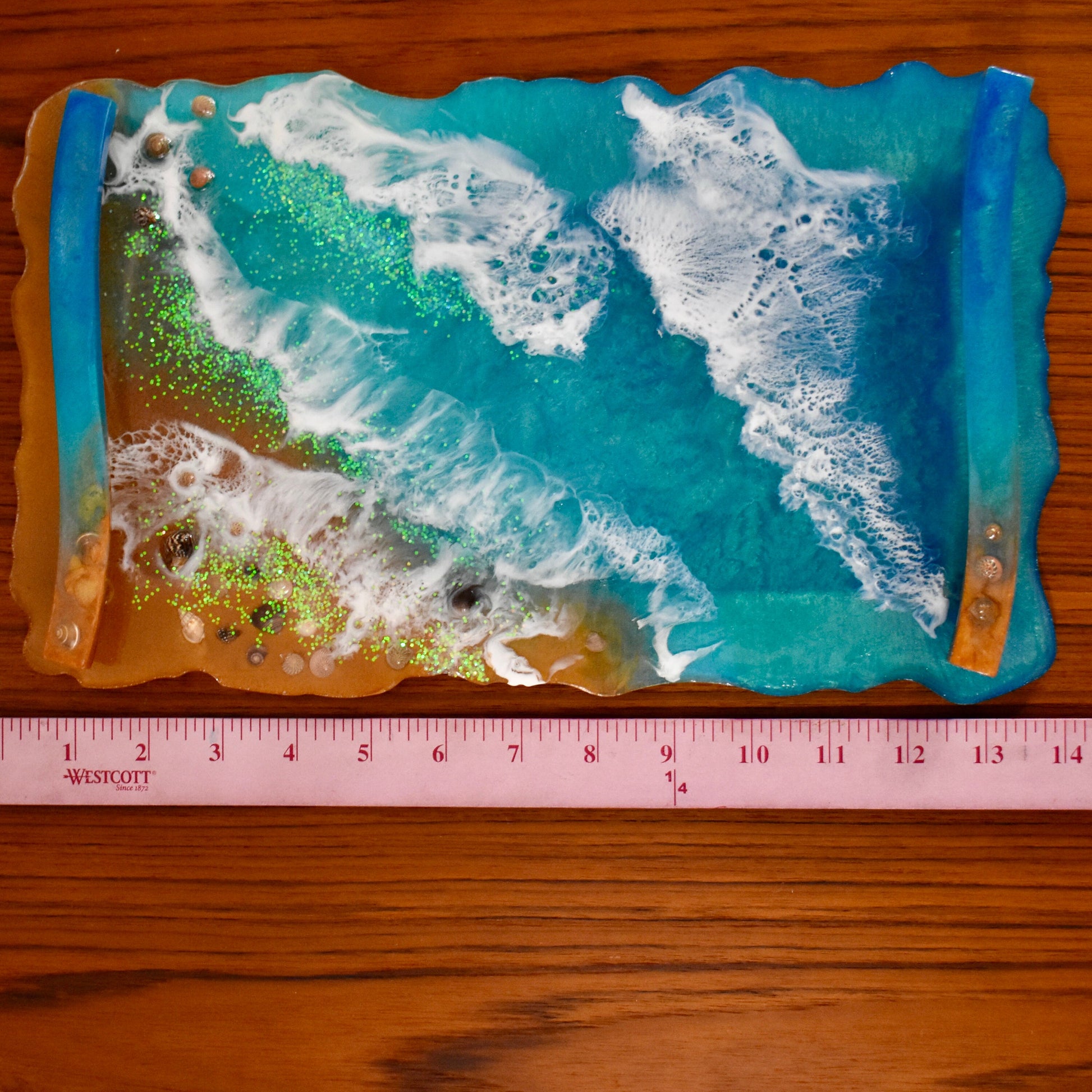 Create a relaxed beach vibe by adding this ocean themed serving tray to your table top! This made-to-order tray features shimmering shades of ocean blue and green with lots of white seafoam! This tray also has matching handles. This tray will inspire conversation every time your guests pick up their appetizing snack. This serving tray can be used for many things: serving tray, vanity tray, trinkets on your dresser! This beach vibe serving tray fits any décor – formal, contemporary, or casual. This is a sample. Please CUSTOM ORDER a tray to match your home décor or in gift recipients favorite colors! With a choice of using two colors, each tray is made to order and unique to only you as no two pours are exactly alike! Message me with any additional questions you may have.