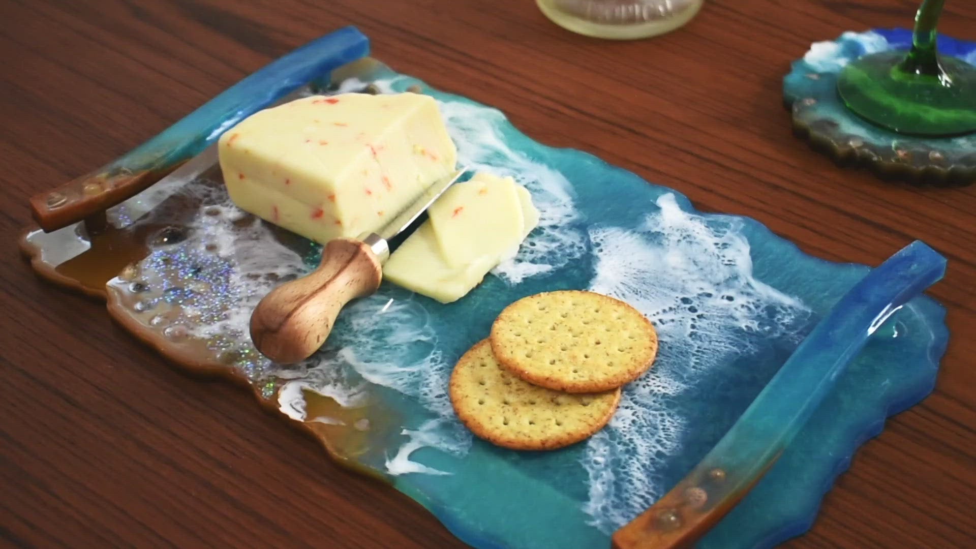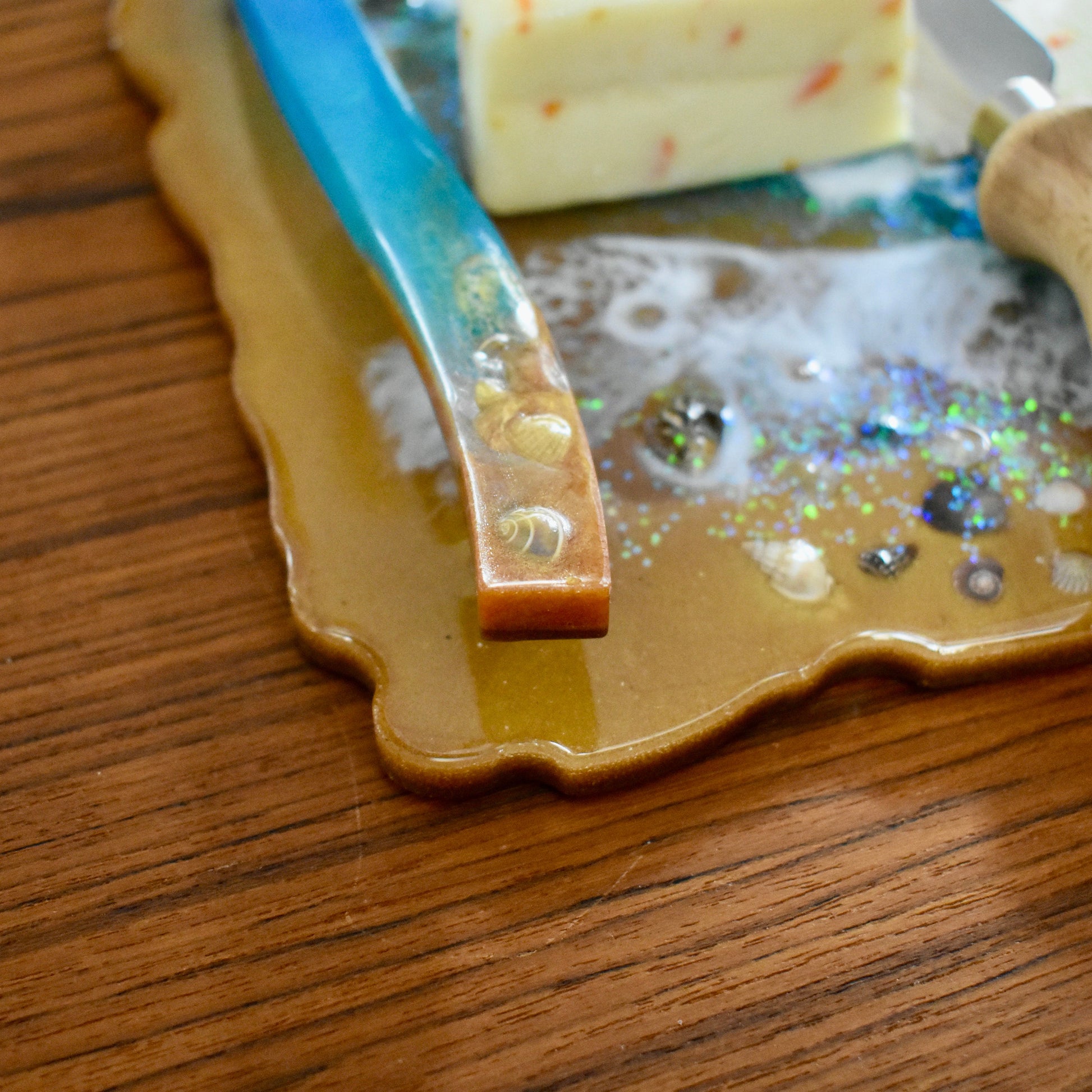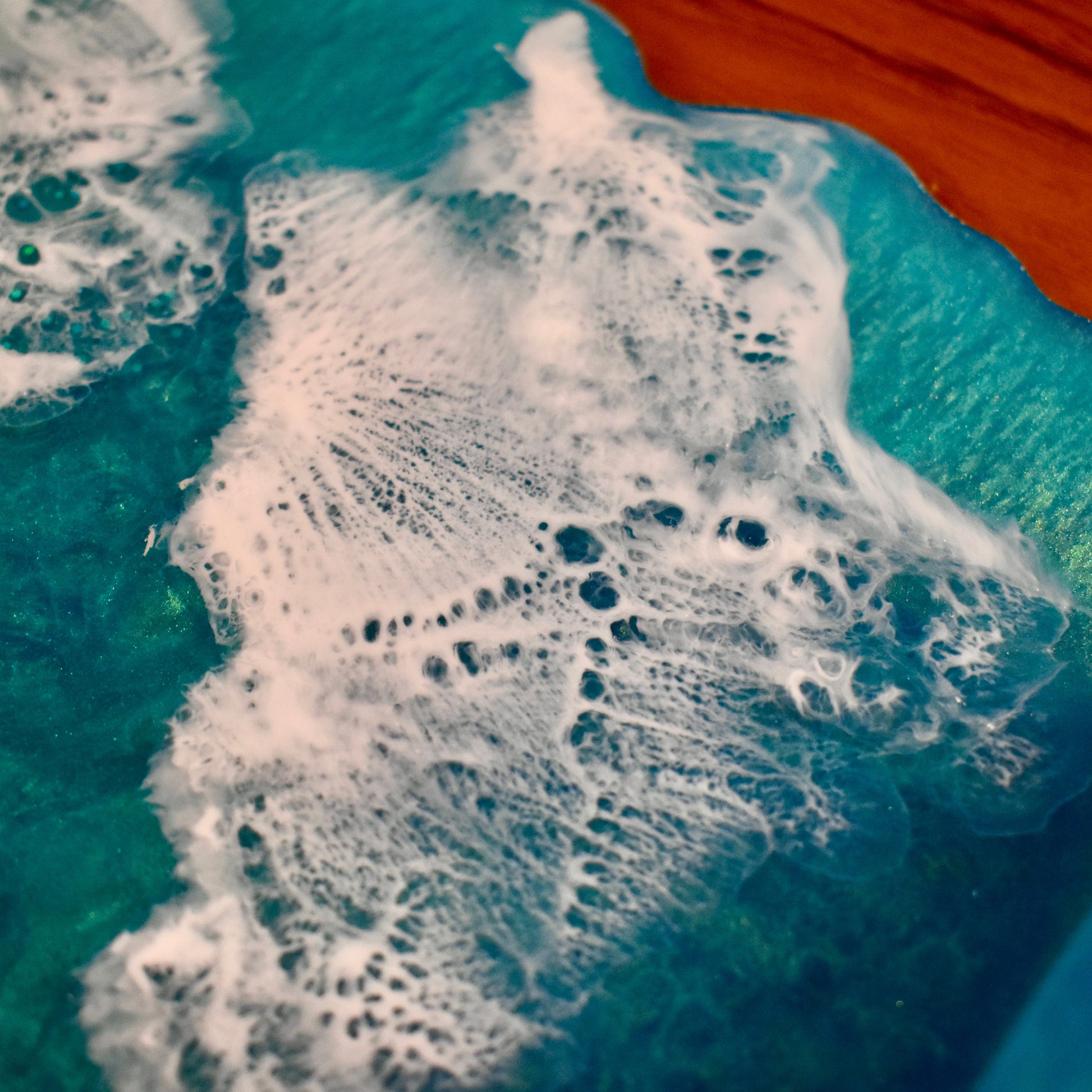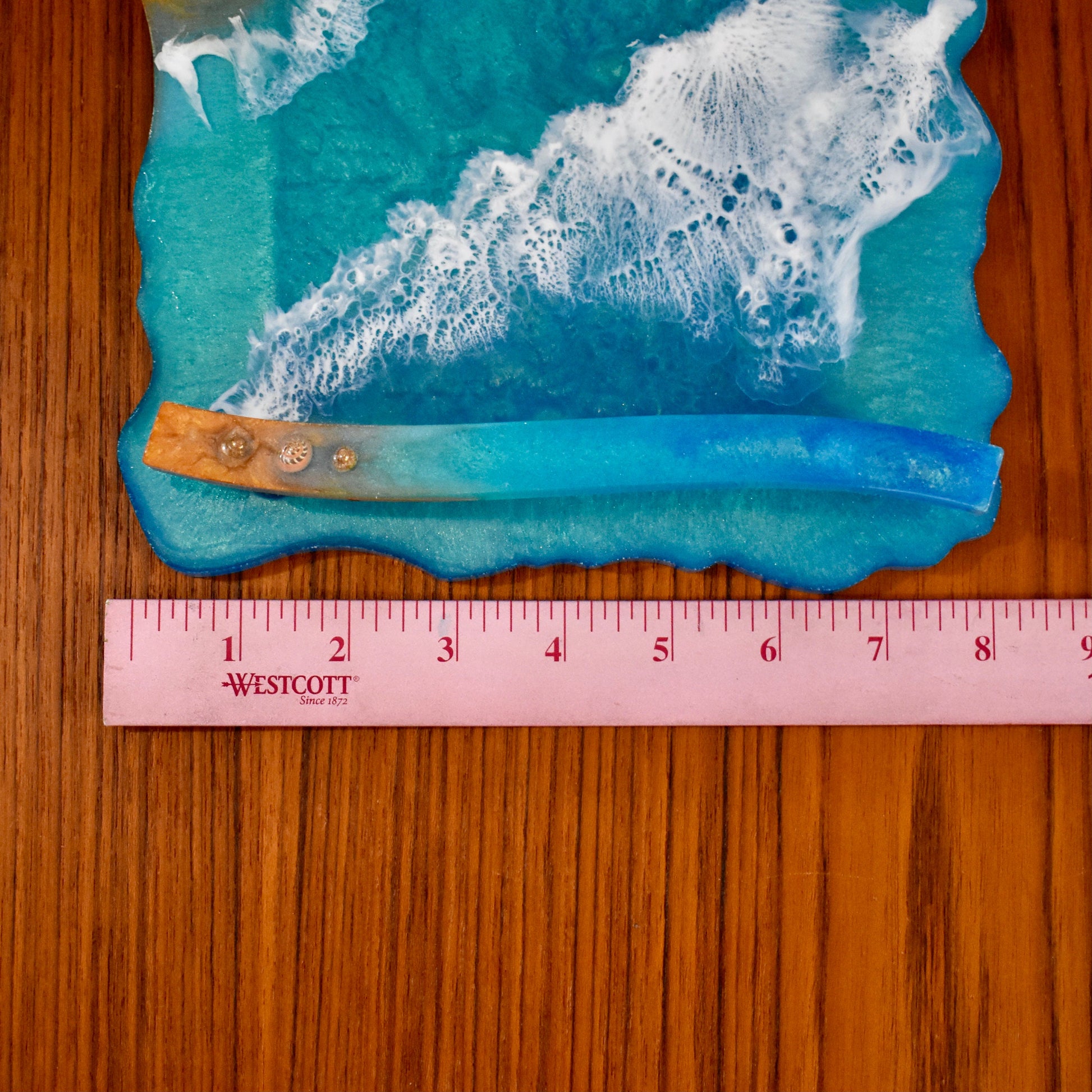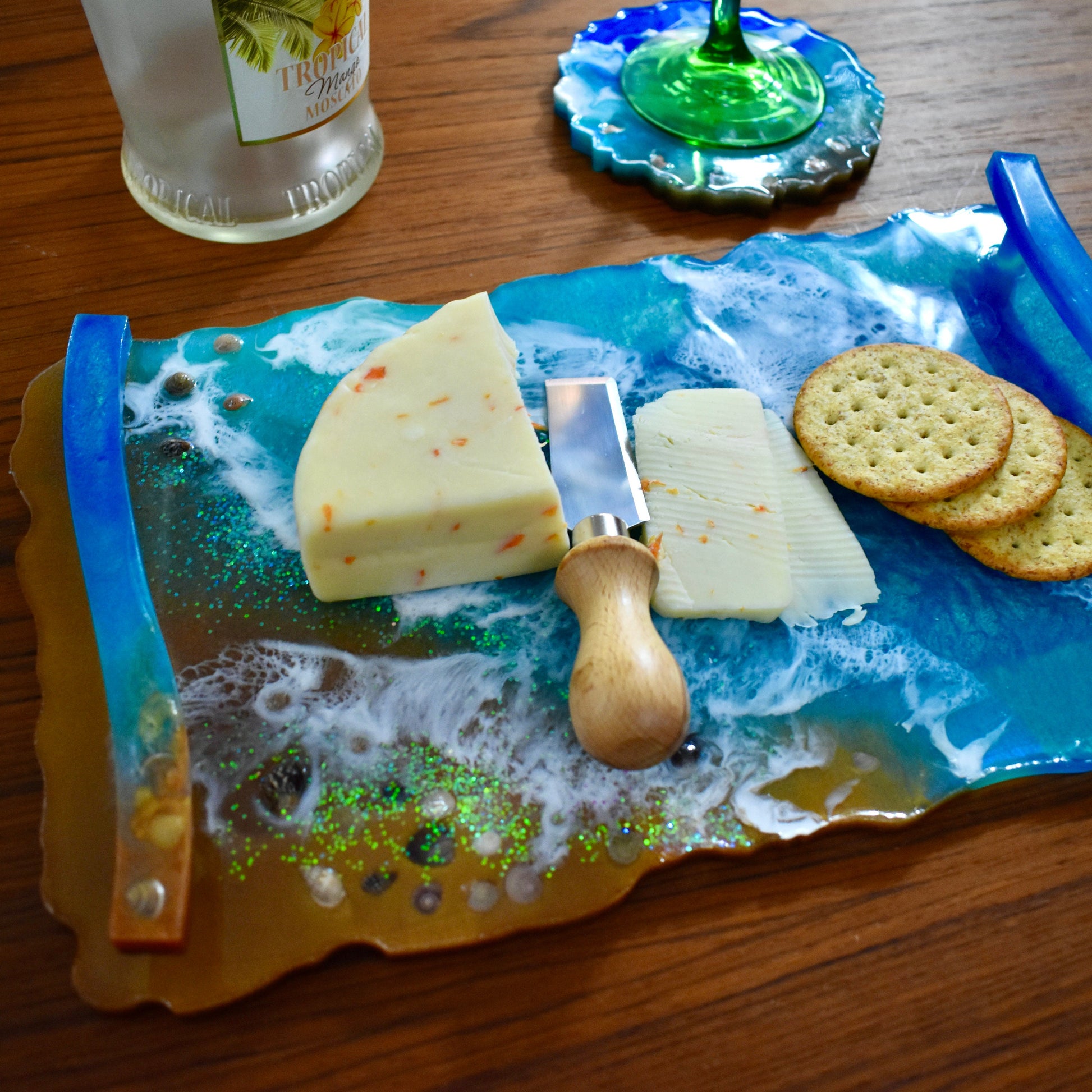 Create a relaxed beach vibe by adding this ocean themed serving tray to your table top! This made-to-order tray features shimmering shades of ocean blue and green with lots of white seafoam! This tray also has matching handles. This tray will inspire conversation every time your guests pick up their appetizing snack. This serving tray can be used for many things: serving tray, vanity tray, trinkets on your dresser! This beach vibe serving tray fits any décor – formal, contemporary, or casual. This is a sample. Please CUSTOM ORDER a tray to match your home décor or in gift recipients favorite colors! With a choice of using two colors, each tray is made to order and unique to only you as no two pours are exactly alike! Message me with any additional questions you may have.