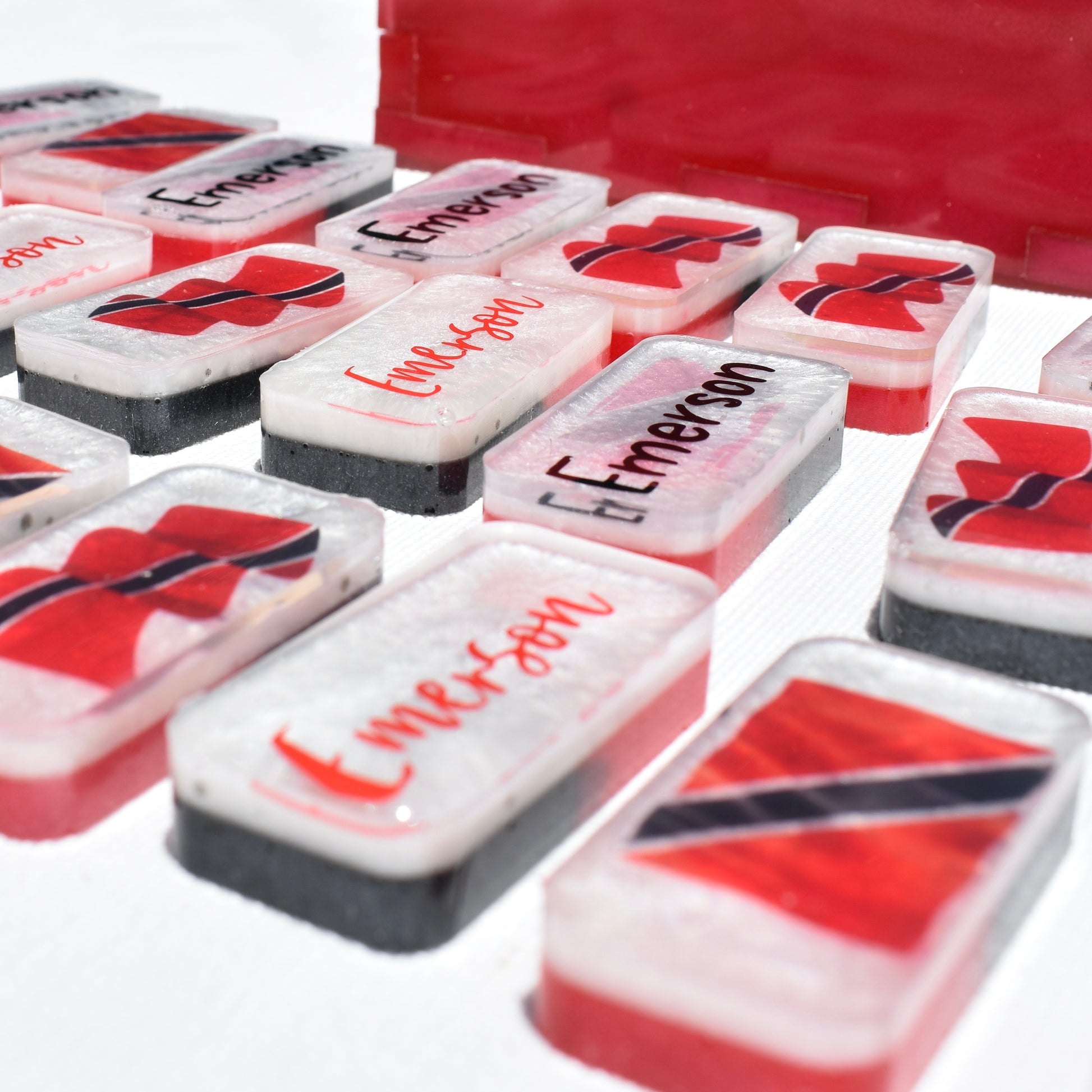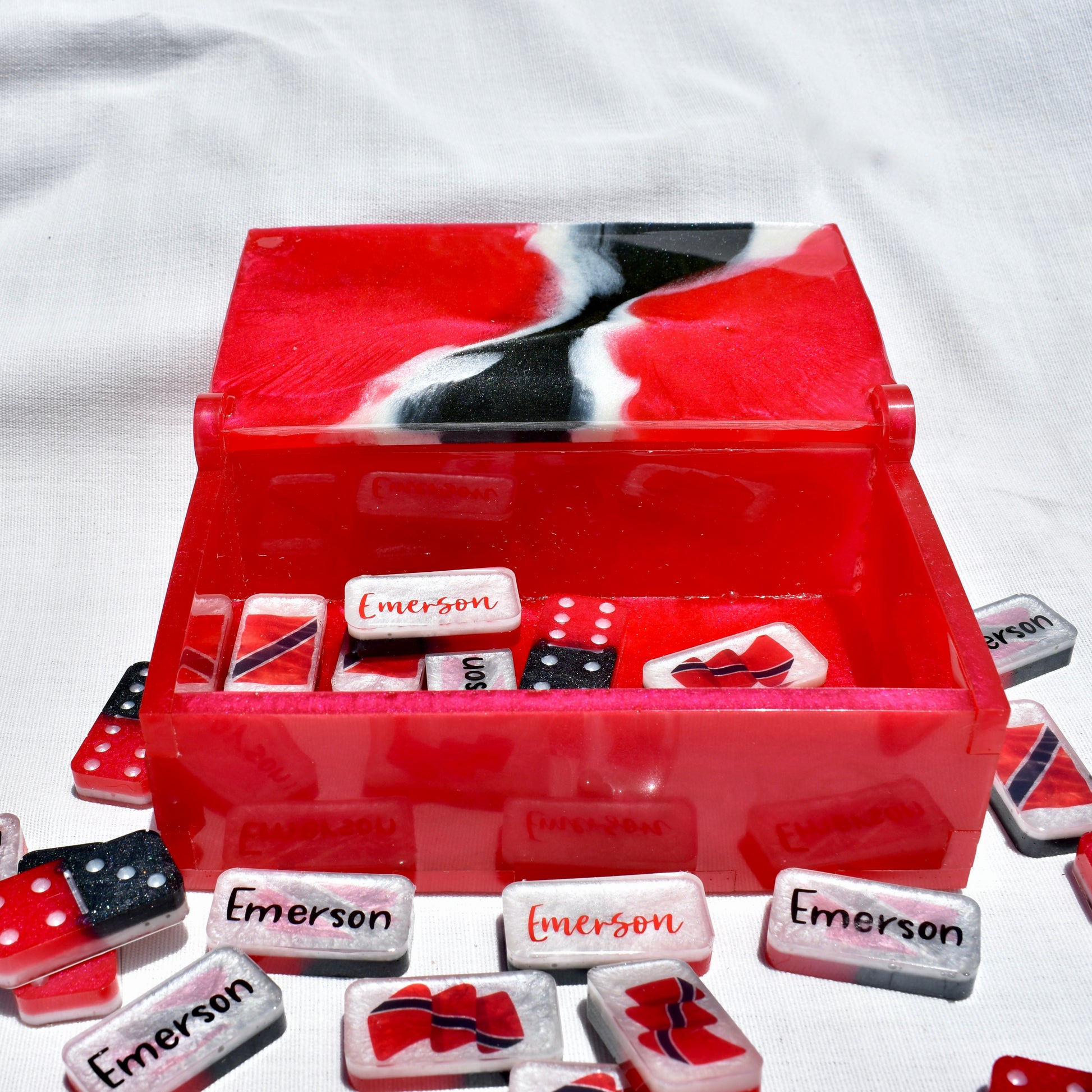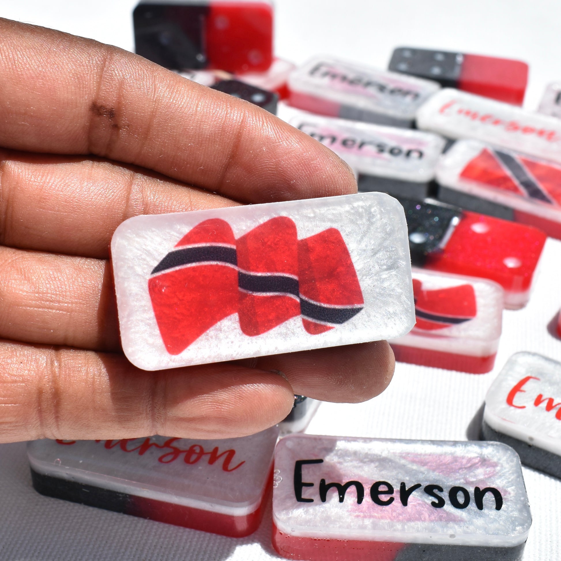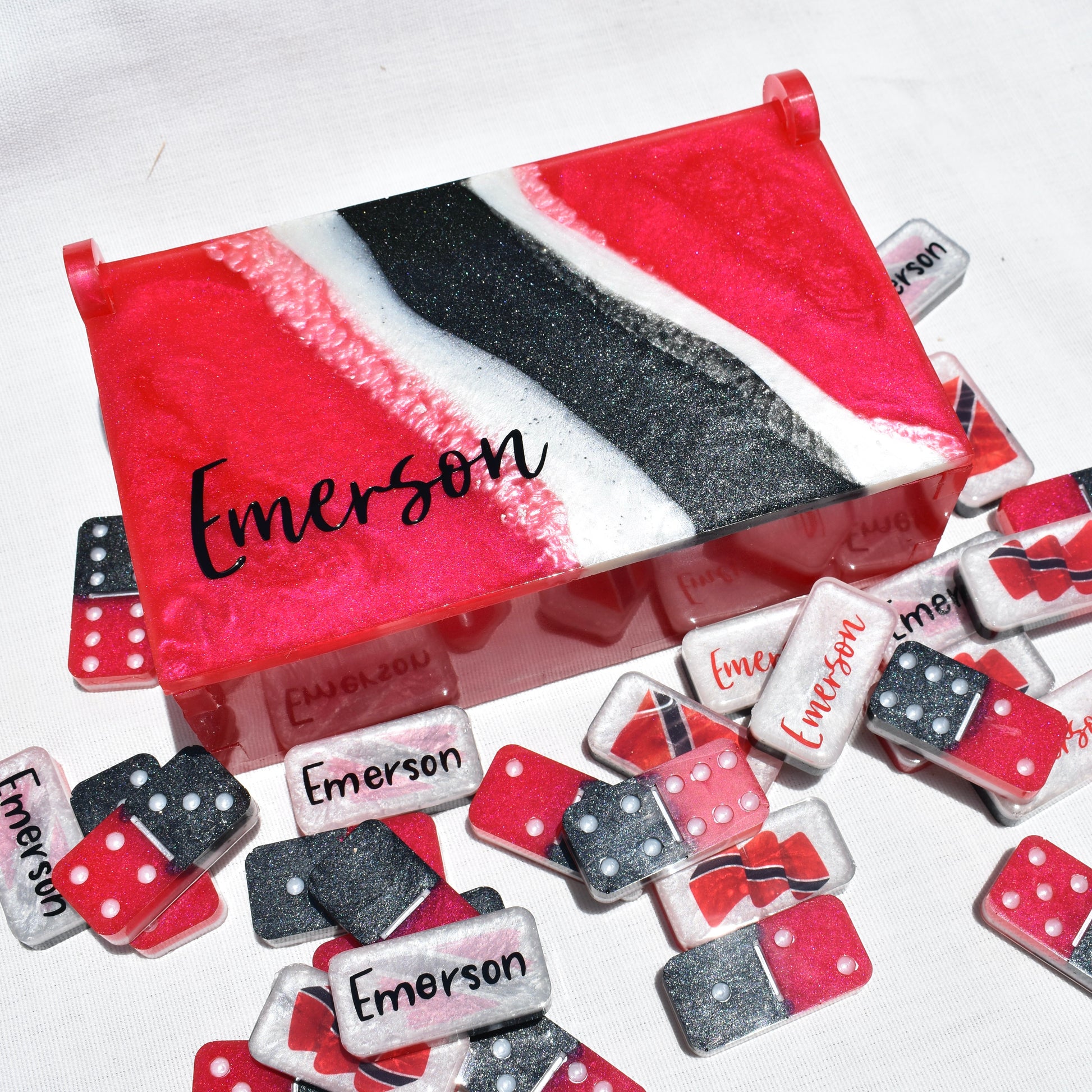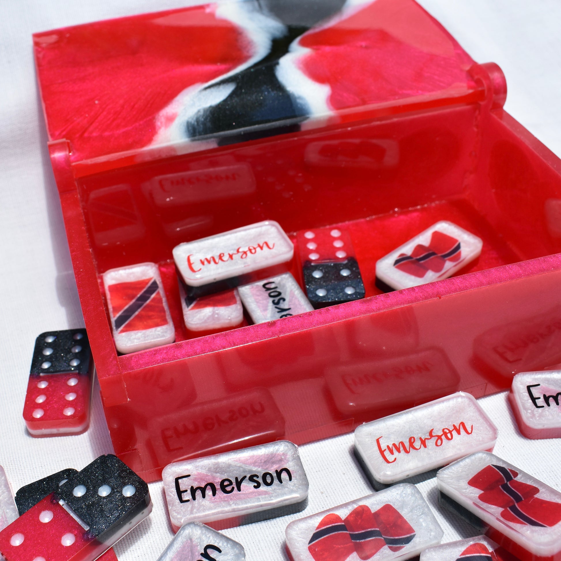 Your Dad, Mom, or BFF will love playing their favorite game of dominoes with a set of bones PERSONALIZED with their name! Family or friends game night will be great fun with this decorative Trinidadian-inspired domino game set! This standard double-six set features 28 thick domino pieces AND matching storage bag inspired by the culture of Trinidad & Tobago. This striking made-to-order game set has recessed dots/pips and is embellished with assorted TT national flag artwork! This domino set complements any décor – formal, contemporary, or casual – and will be a focal point on any room. Place it in a living room, dining room, game room, or office. Each one is handcrafted, unique, and combines art and function! Includes complementary storage bag. You can order a custom order a matching storage box.