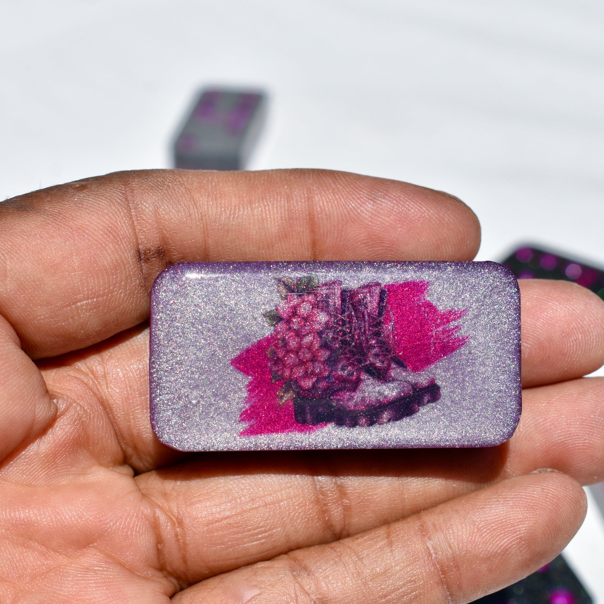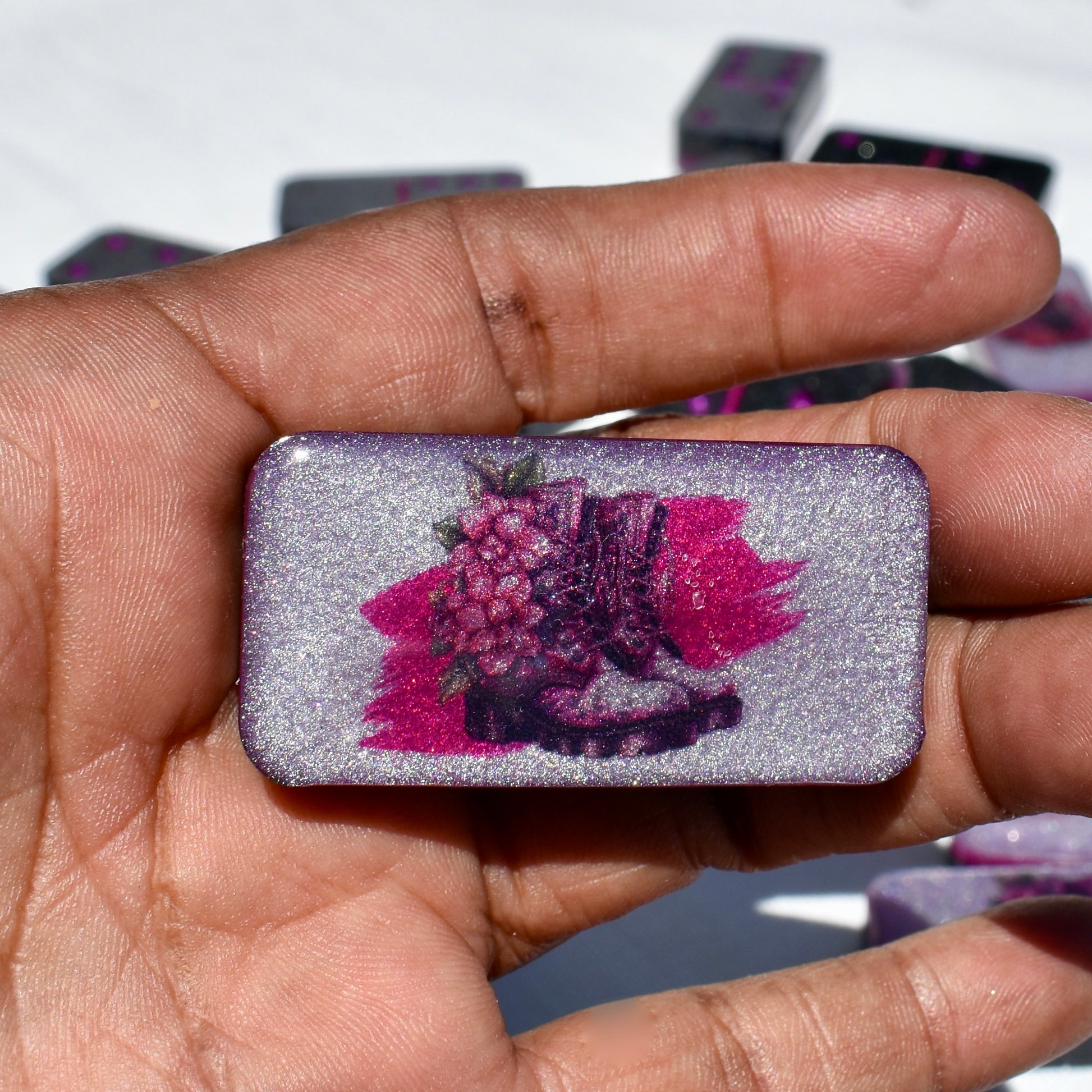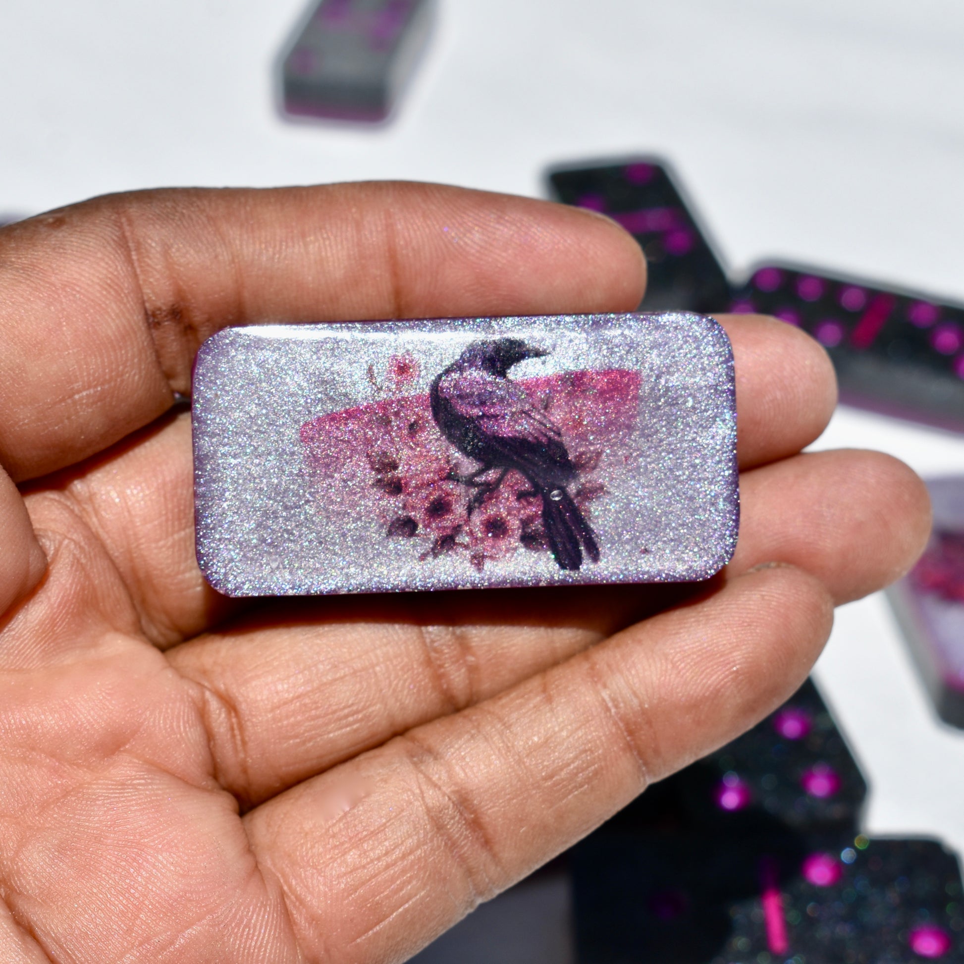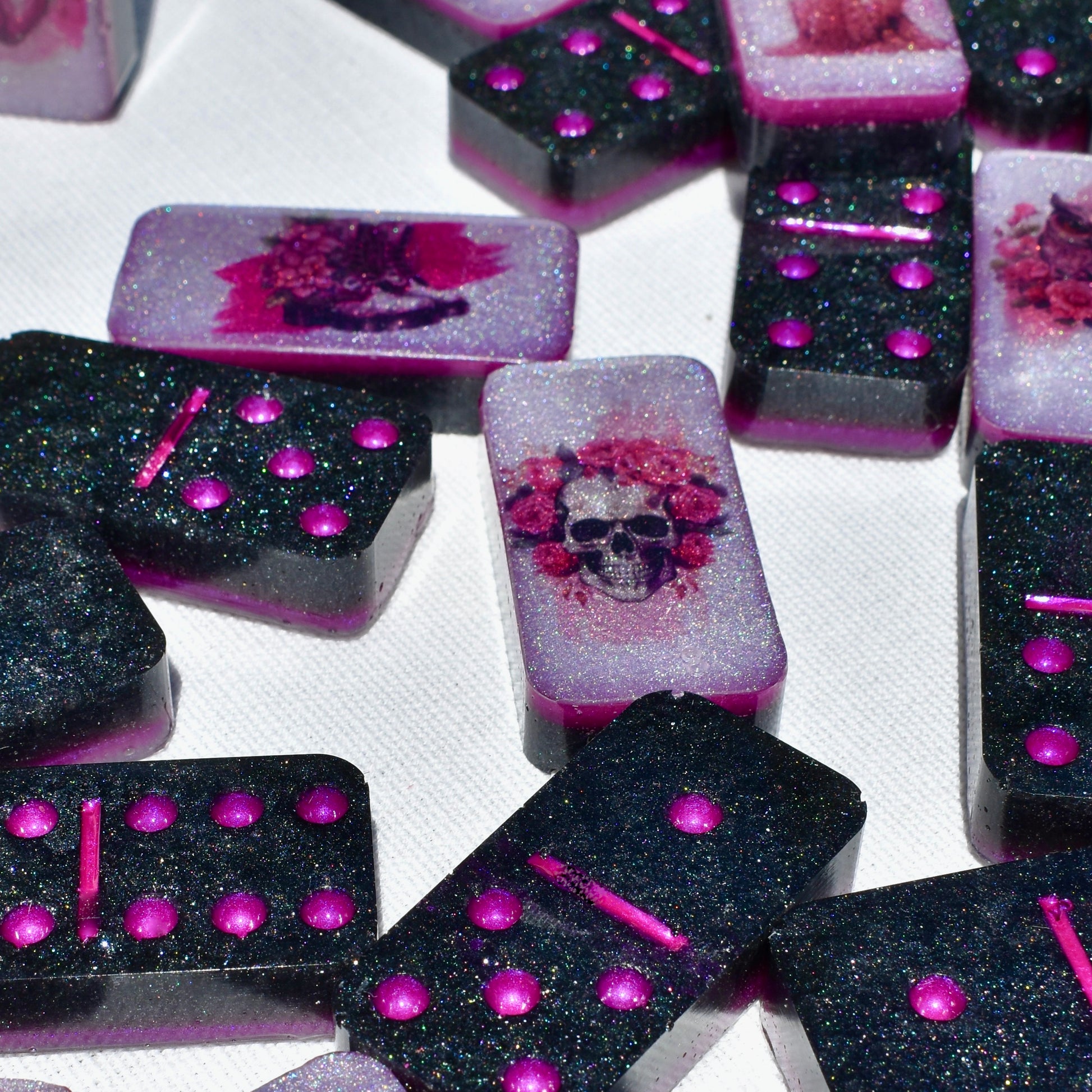 This shimmery black and hot pink domino set will bring hours of fun during your get-togethers with your goth friends! Family or friends game night will be great fun with this decorative domino game set! This standard double-six set features 28 thick domino pieces AND matching storage bag. The dominoes are embellished with assorted gothic themed artwork including a skull and pink roses, skeleton hand, raven, heart, and goth boots! 🥀This domino set is not macabre but, instead, complements any décor – formal, contemporary, or casual – and will be a focal point on any room. Place it in a living room, dining room, game room, or office. Each one is handcrafted, meticulously hand-painted, and combines art and function! Includes complementary storage bag. You can order a custom order a matching storage box personalized with a name.