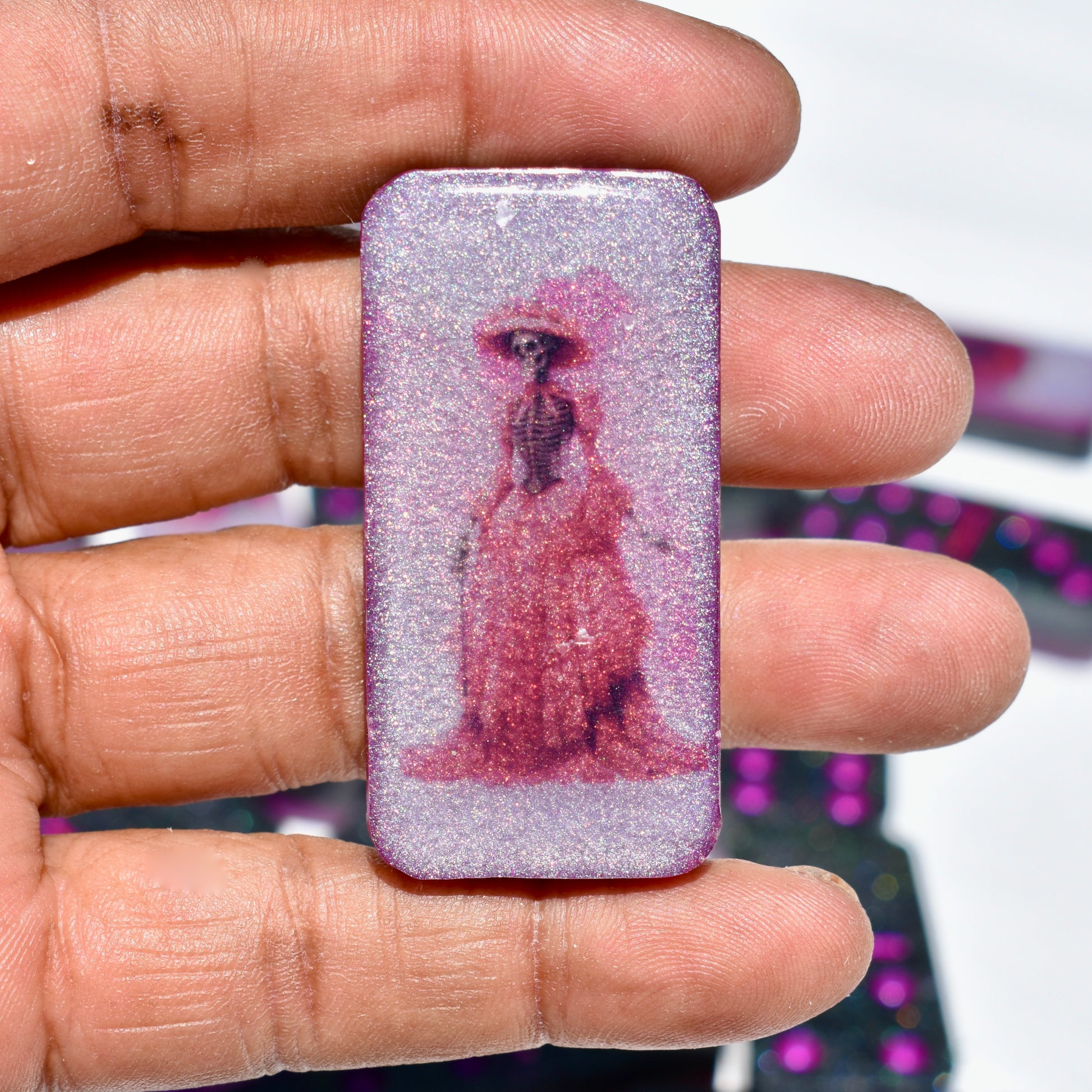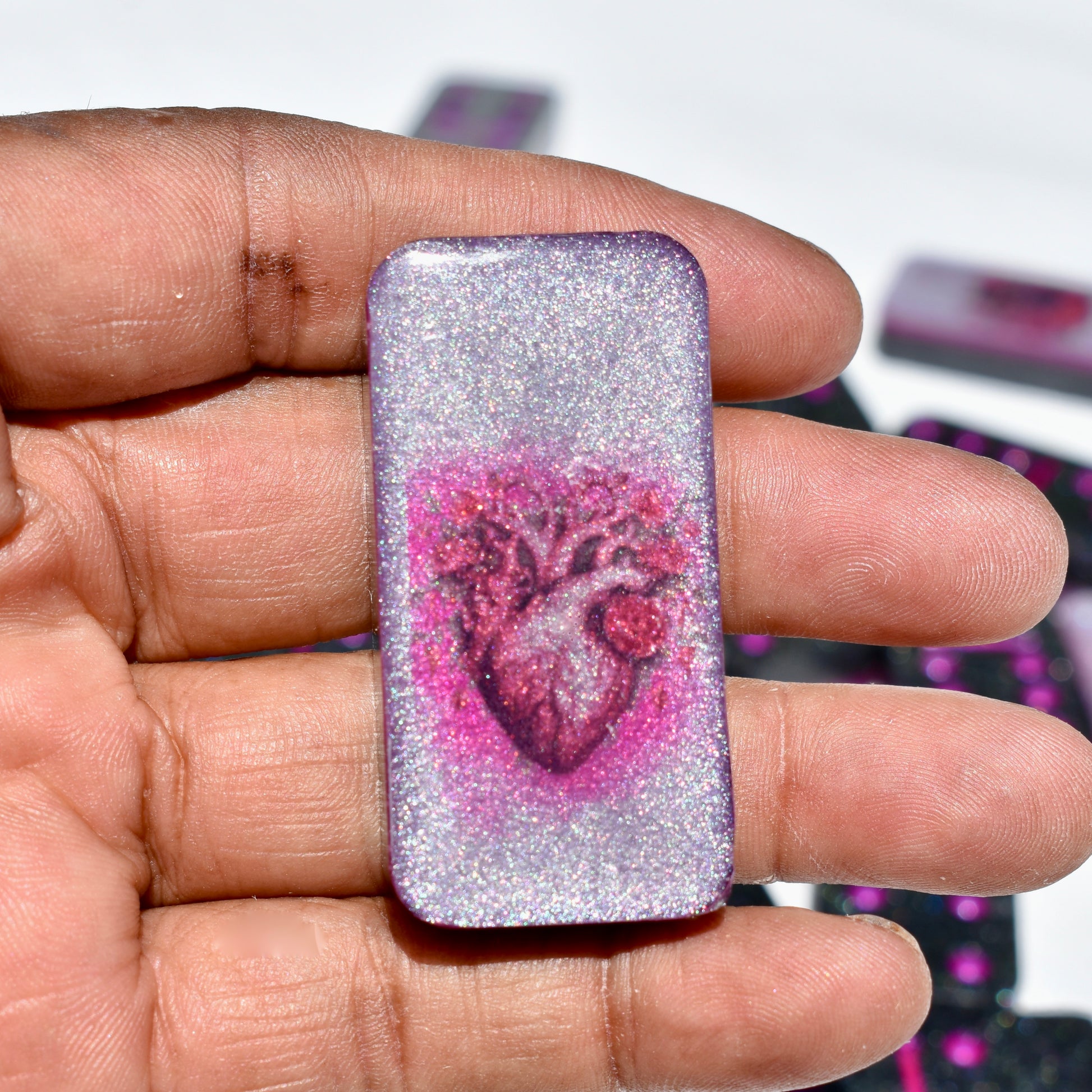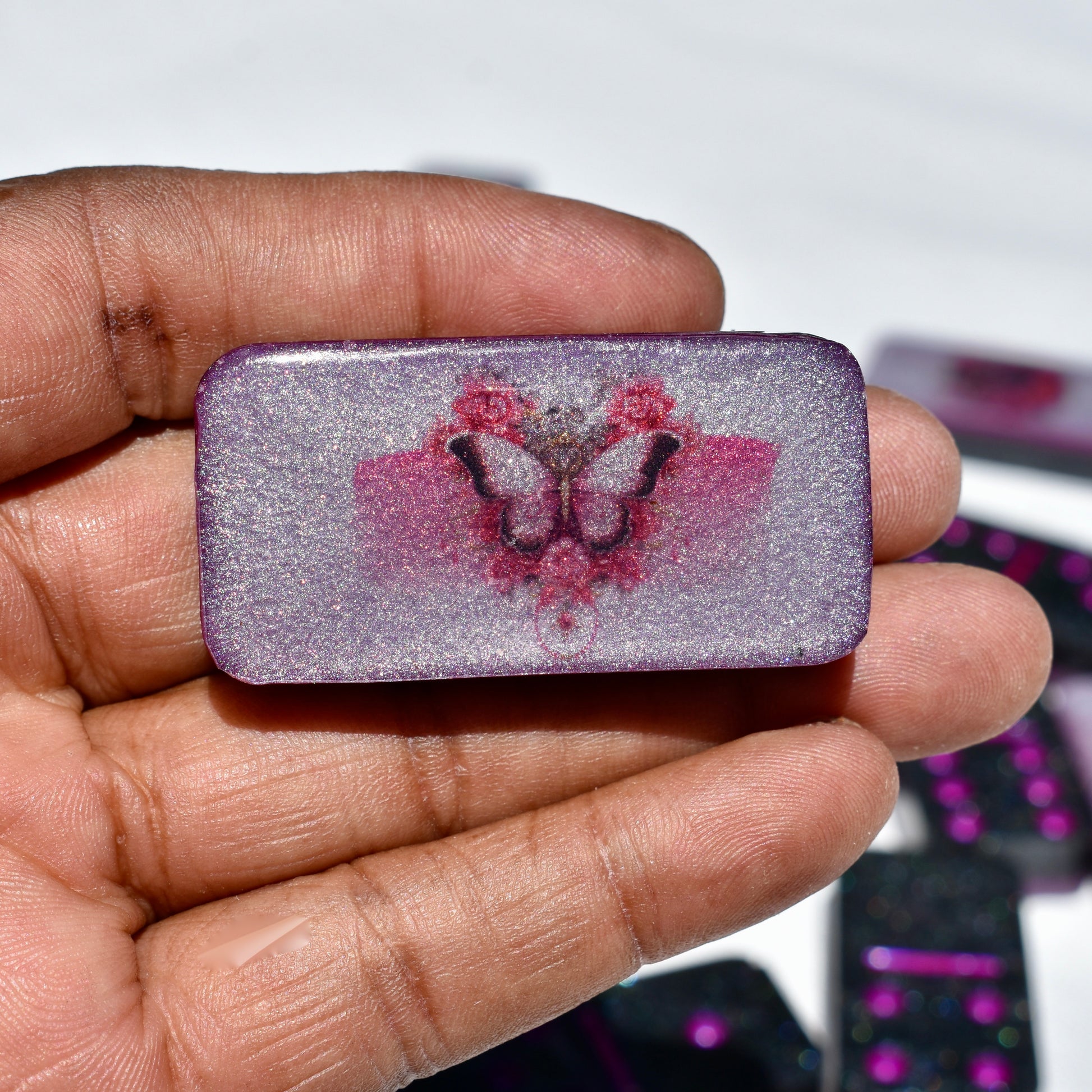 This shimmery black and hot pink domino set will bring hours of fun during your get-togethers with your goth friends! Family or friends game night will be great fun with this decorative domino game set! This standard double-six set features 28 thick domino pieces AND matching storage bag. The dominoes are embellished with assorted gothic themed artwork including a skull and pink roses, skeleton hand, raven, heart, and goth boots! 🥀This domino set is not macabre but, instead, complements any décor – formal, contemporary, or casual – and will be a focal point on any room. Place it in a living room, dining room, game room, or office. Each one is handcrafted, meticulously hand-painted, and combines art and function! Includes complementary storage bag. You can order a custom order a matching storage box personalized with a name.