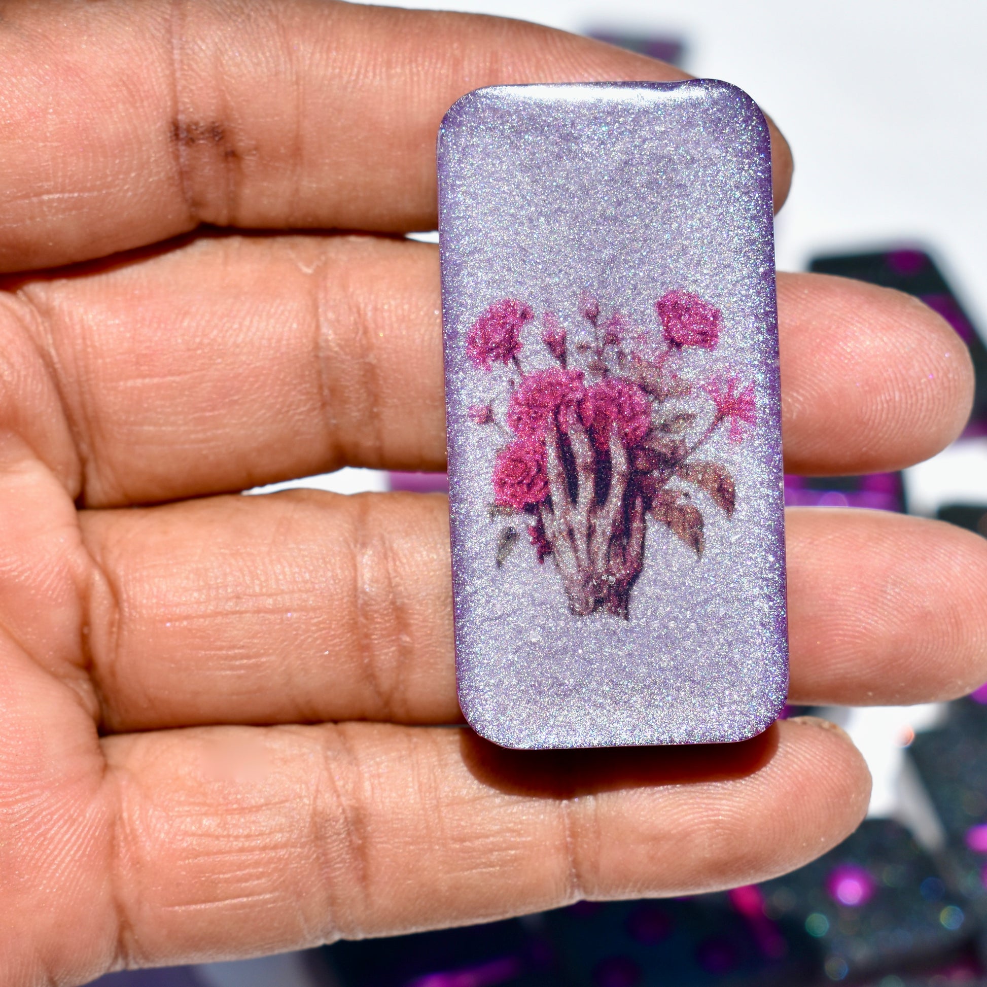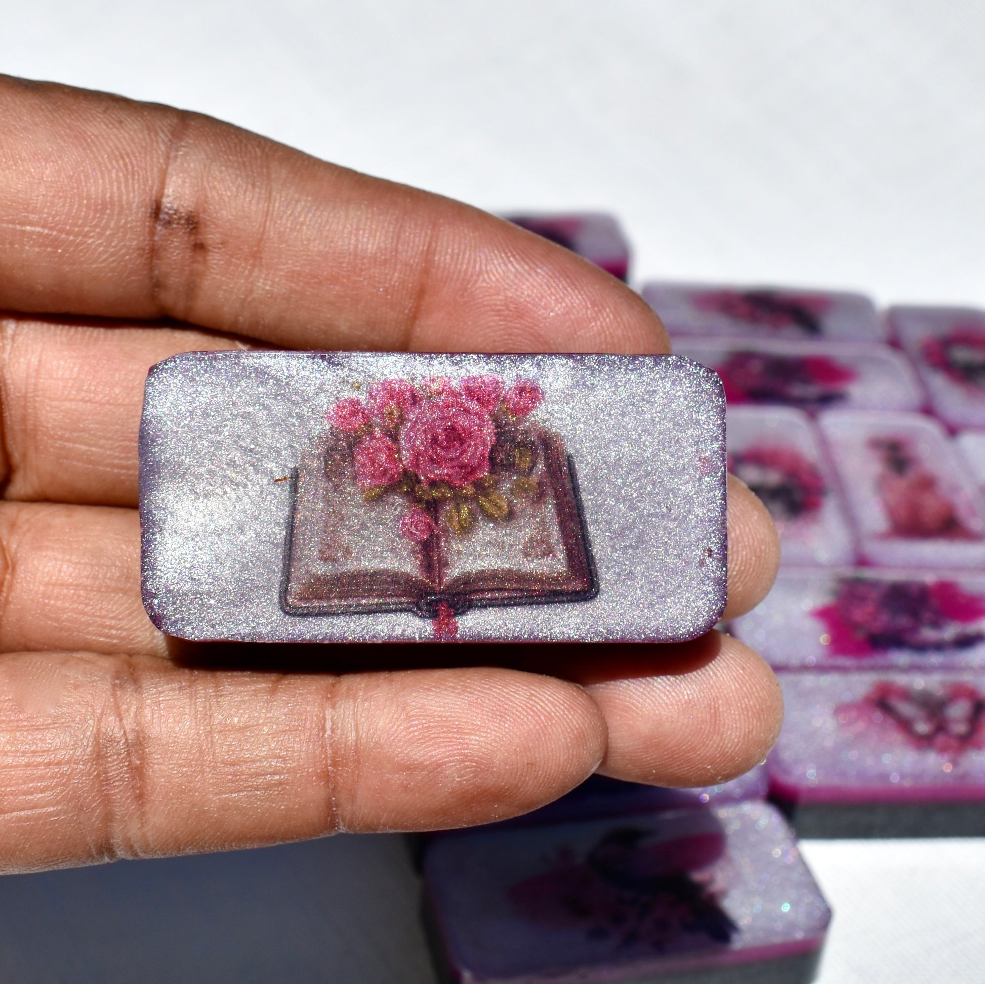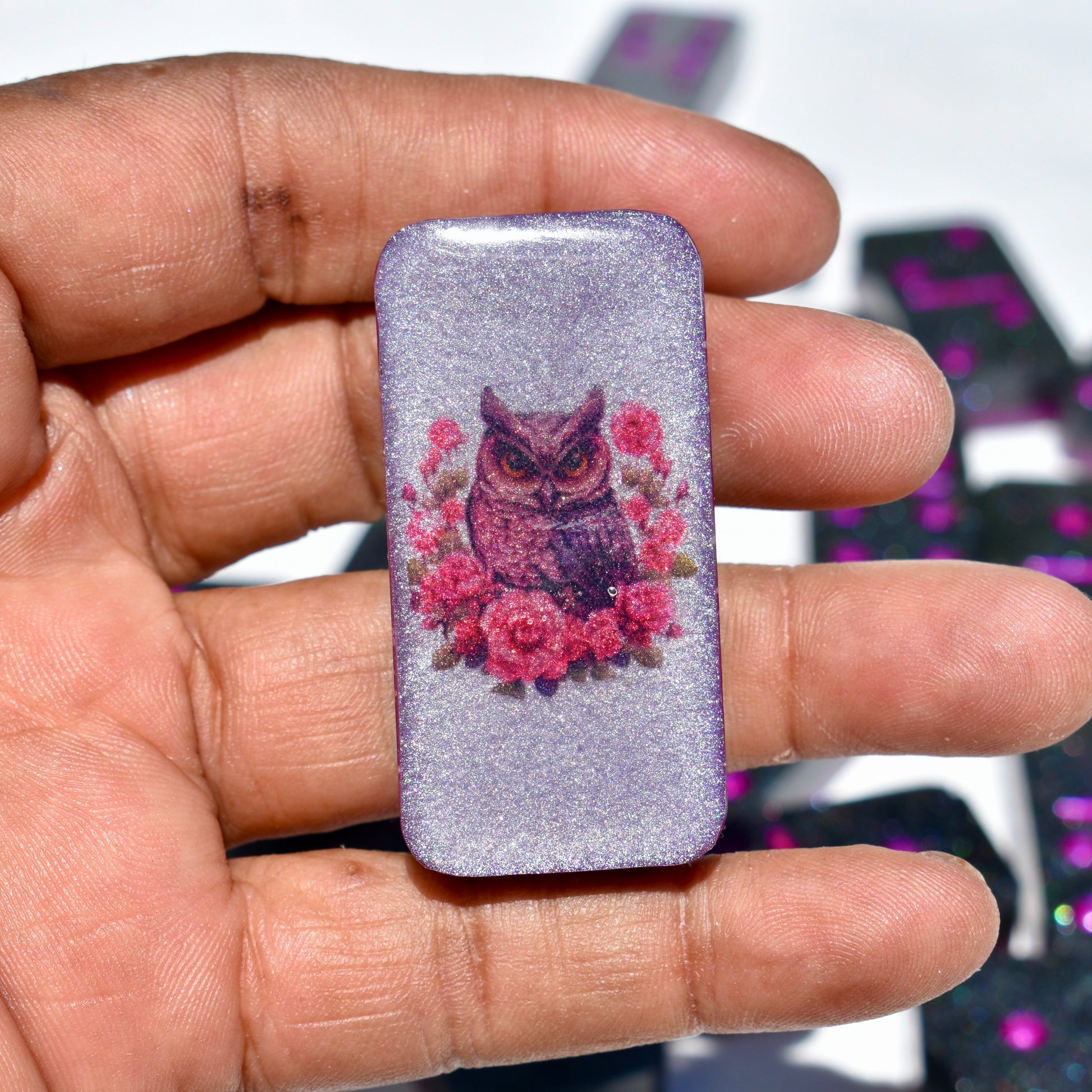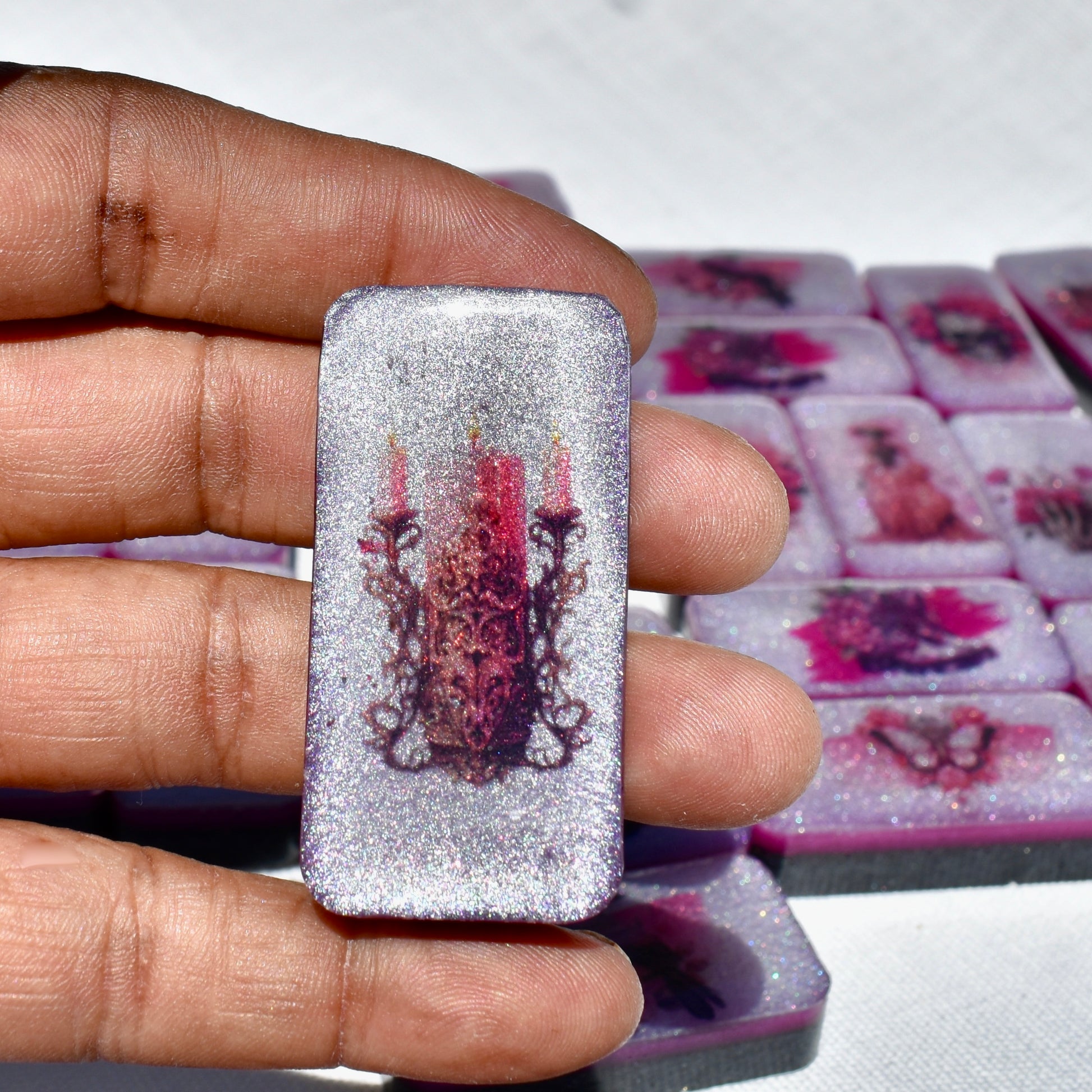 This shimmery black and hot pink domino set will bring hours of fun during your get-togethers with your goth friends! Family or friends game night will be great fun with this decorative domino game set! This standard double-six set features 28 thick domino pieces AND matching storage bag. The dominoes are embellished with assorted gothic themed artwork including a skull and pink roses, skeleton hand, raven, heart, and goth boots! 🥀This domino set is not macabre but, instead, complements any décor – formal, contemporary, or casual – and will be a focal point on any room. Place it in a living room, dining room, game room, or office. Each one is handcrafted, meticulously hand-painted, and combines art and function! Includes complementary storage bag. You can order a custom order a matching storage box personalized with a name.